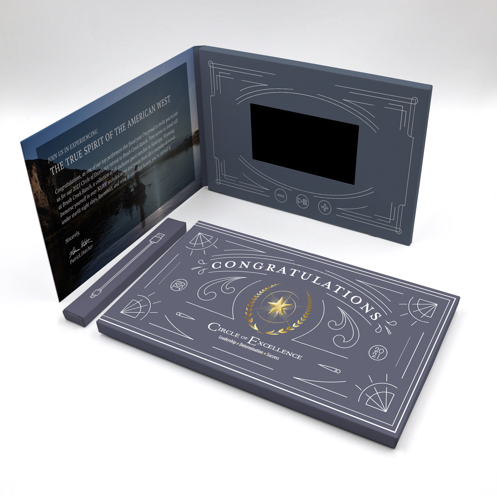 The 2021 invitation utilized a custom video mailer that included a letter from Vistar’s Senior Vice President and played a teaser trailer of the experience upon opening. I drew inspiration from vintage western wear brands like H Bar C and Rockmount Ranch Wear when crafting the design for the panels of the mailer with the goal of complimenting the Brush Creek brand while including the pre-existing elements from Circle of Excellence.